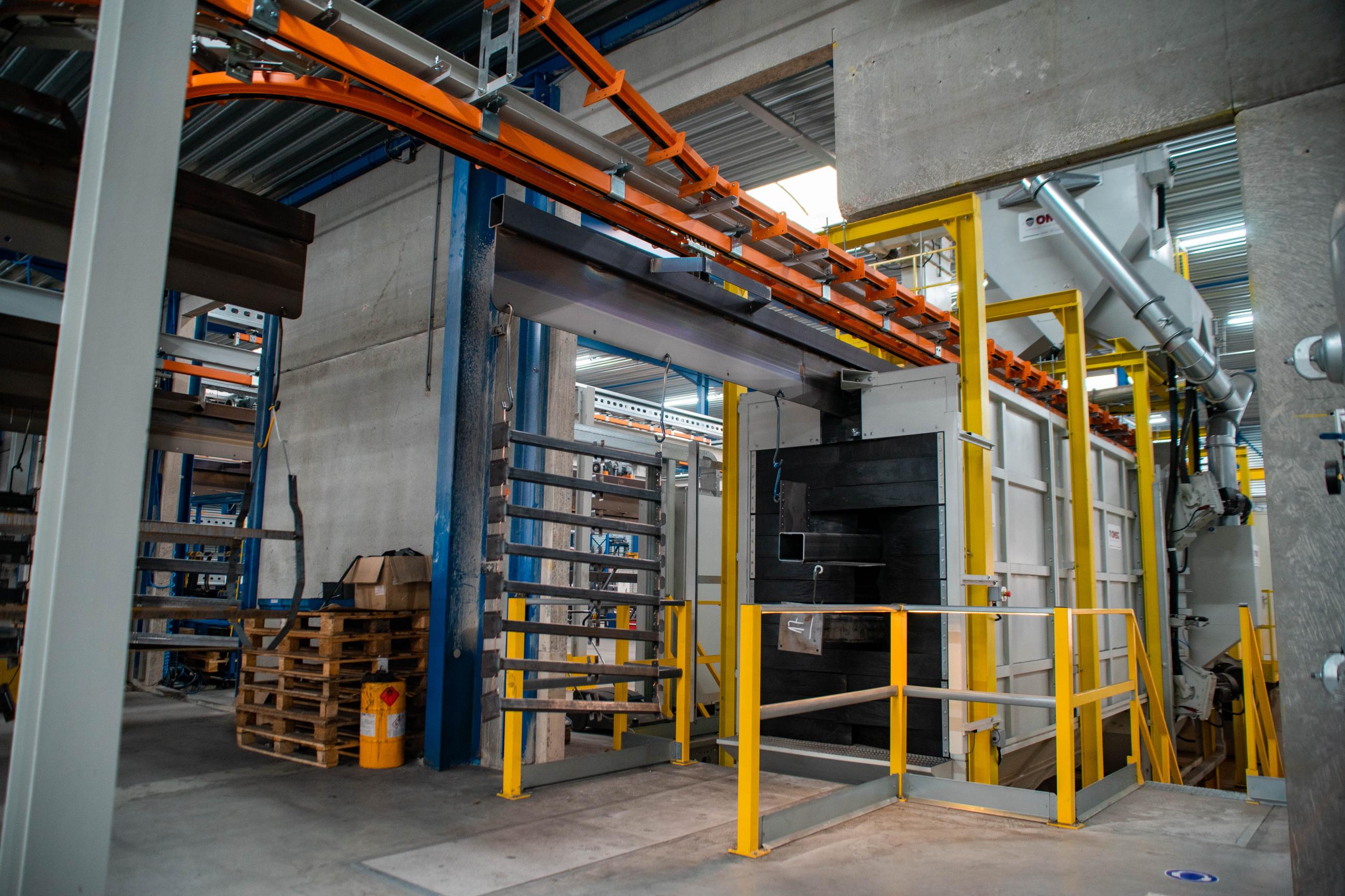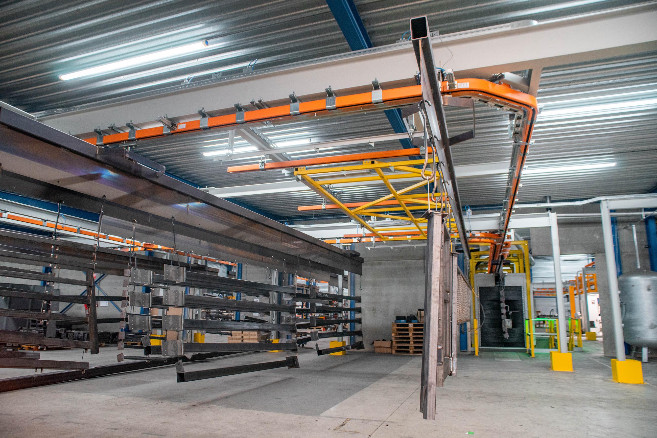 The products run through a sandblasting unit, powder coating line, and there are multiple drop-sections for loading and unloading. Each traverse measures 11m, can handle loads ups to 1250kg and be combined to heat treat products, mainly plate steel profiles, together in the oven cassette system.